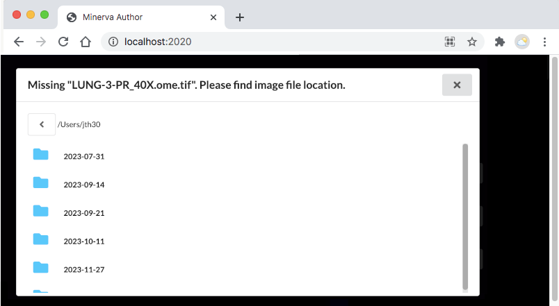 The path to your image is written in the .story.json file when you save or export a Minerva Story. When you open a story file, if Minerva cannot find the image using the path in the file it will prompt you to provide a new path. An example of this is shown in the image below.